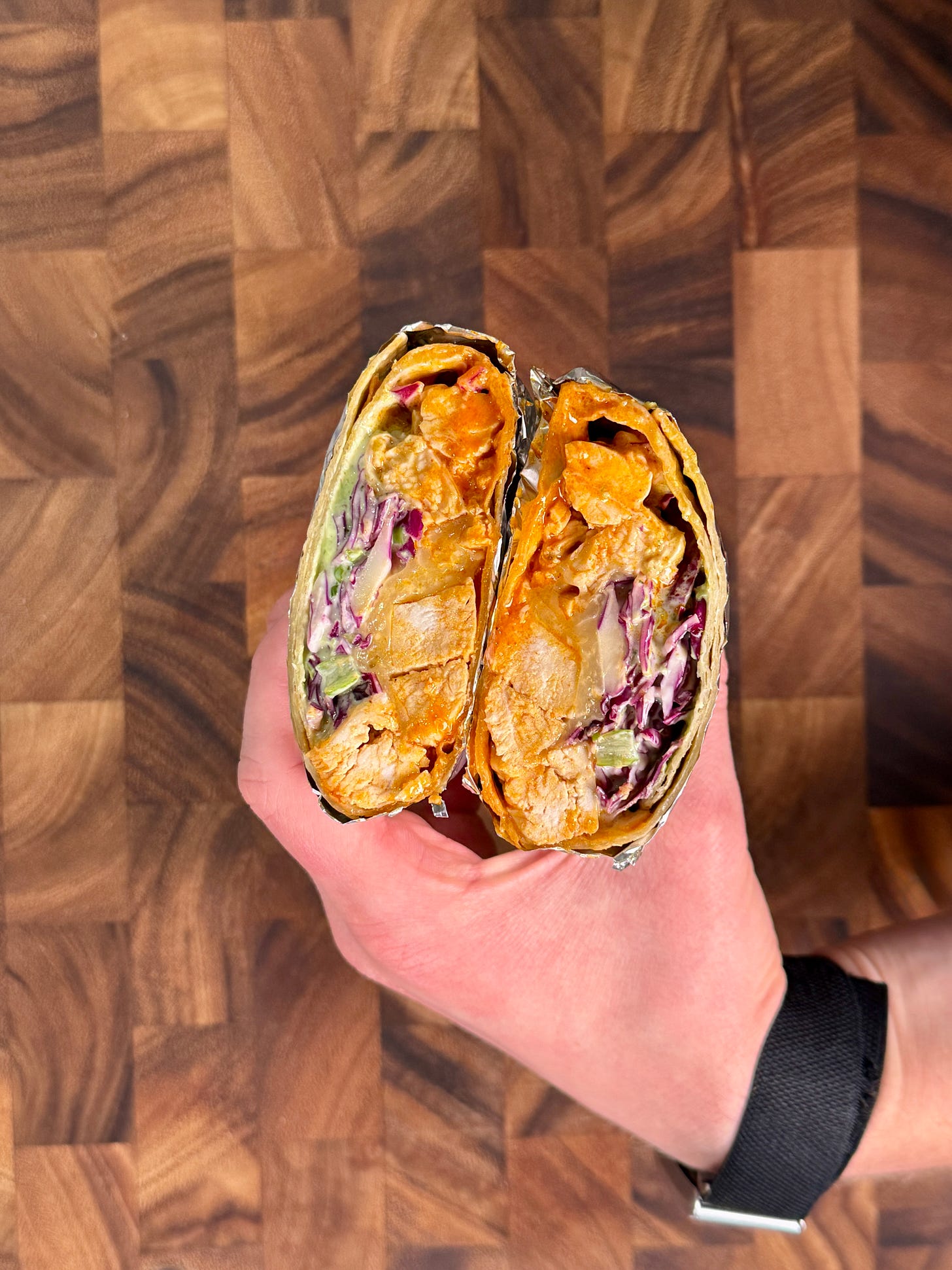 Time to assemble! (Repeat this 2x) Place your tortilla down, add half the chicken and sauce to the middle and top with half of the cheese. Put it under the broiler for about 1 minute (be careful not to leave it under too long or the tortilla will become too crispy to wrap). After the cheese is melted, top it with some of the slaw and crema to your preference.